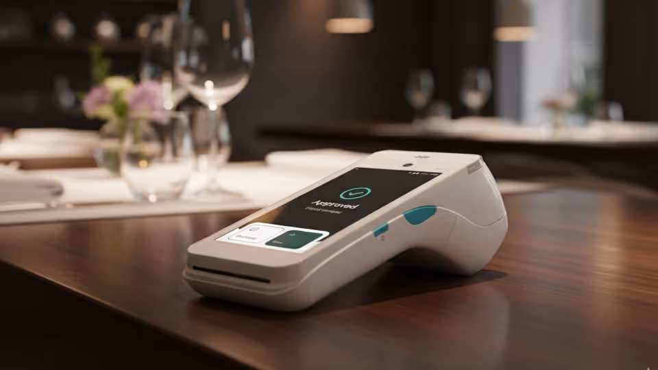 The Dojo Go is a sleek, white, handheld card machine with a clean, ergonomic design, built to fit neatly into your palm.